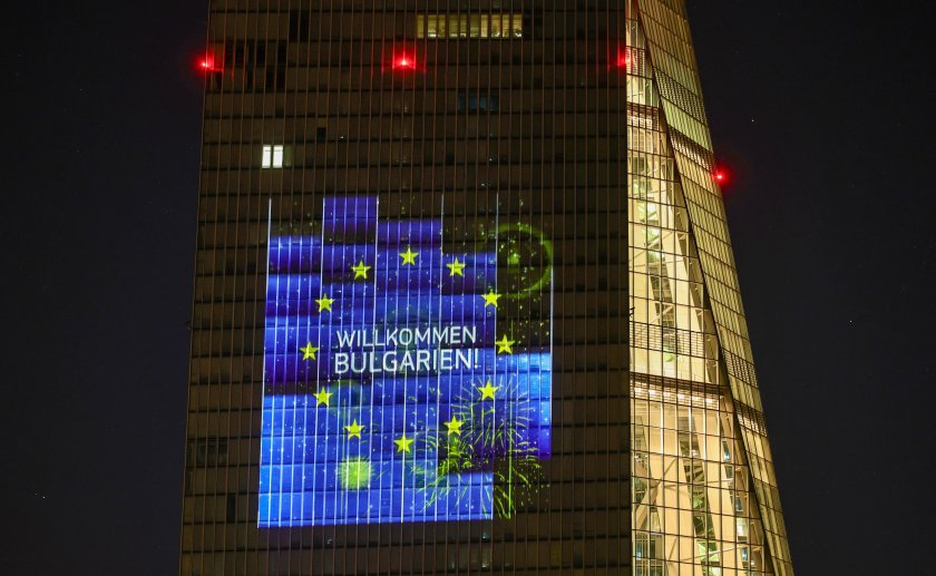 ЕЦБ тества светлинна инсталация по повод присъединяването на България към еврозоната от 1 януари 2026 година.