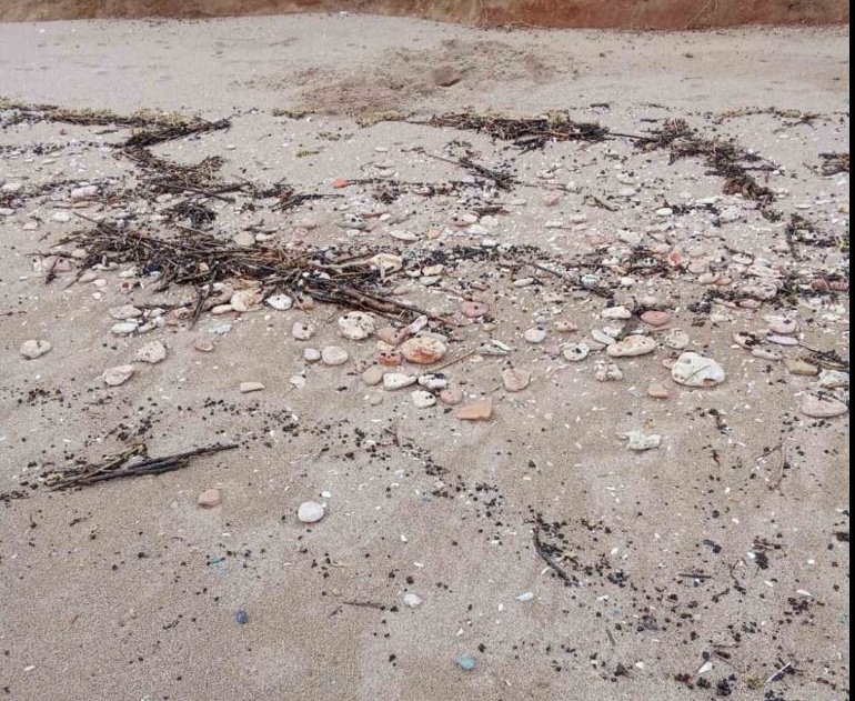 При проверката е установено замърсяване на пясъчната ивица с изхвърлени от вълните черни лепкави парченца, с твърда консистенция, с различна големина и слабо изразен мирис, характерен за нефтопродукти.