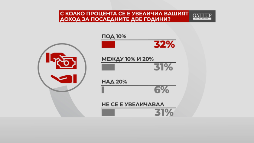 На 32 на сто от запитаните заплатите им са се увеличили с под 10% за последните две години, на 31 на сто – с между 10 и 20%, на 6 на сто – с над 20%, а на други 31 на сто – доходите не са им се увеличили.