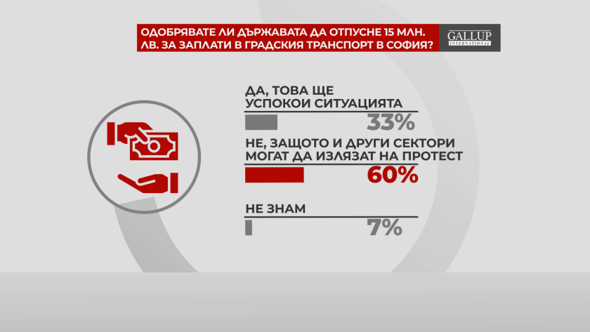Според социологическото проучване на „Галъп“ 60 на сто не одобряват отпуснатите от държавата 15 милиона лева за градския транспорт в София, защото и други сектори биха могли да излязат на протест. 33% смятат, че това би успокоило ситуацията.