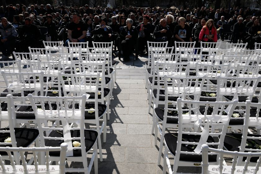 Почернените семейства поставиха 63 бели стола, символ на угасналите 63 живота.