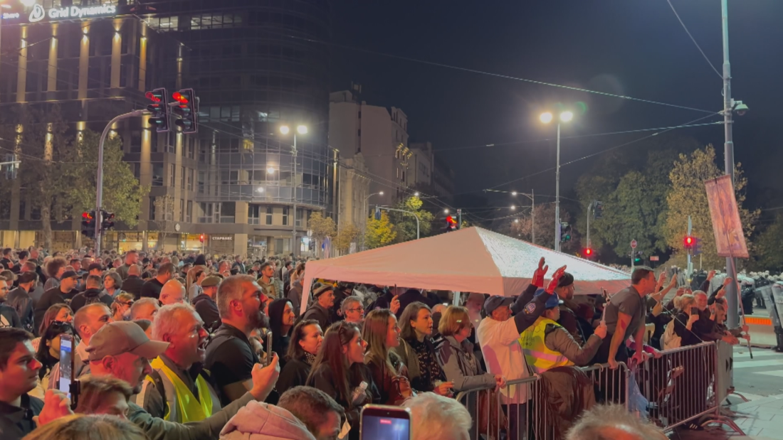 Пред сръбския парламент полицията стои в кордон между протестиращите и контрапротестиращите, подкрепящи президента Александър Вучич. Миналата нощ напрежението ескалира, полетяха бомбички, бутилки и звучни сръбски обиди. От палатковия лагер на контрапротестиращите пускаха силна музика с народни и патриотични песни. Протестиращите отговориха с химна.
